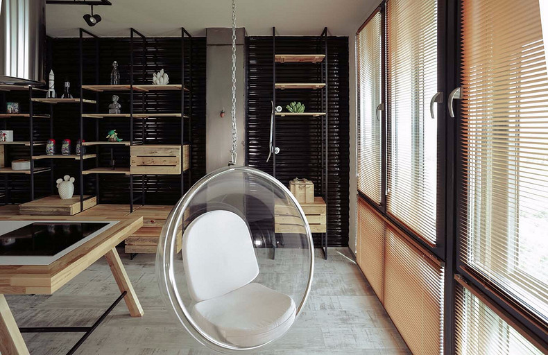 - Мебель: стеллаж (дерево, металл), шкафы (фасады — краска Derufa), стол рабочий, столешница (искусственный камень) — всё на заказ по эскизам автора проекта, подвесное кресло Bubble chare