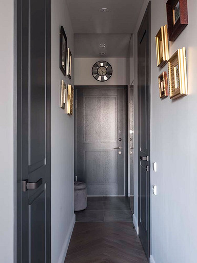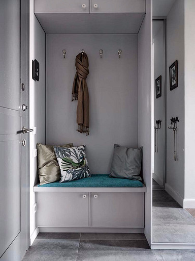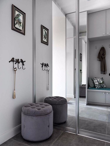 - Мебель: пуф, шкаф встроенный, банкетка (на заказ — Эдуард Бабкин), вешалки настенные Home Concept