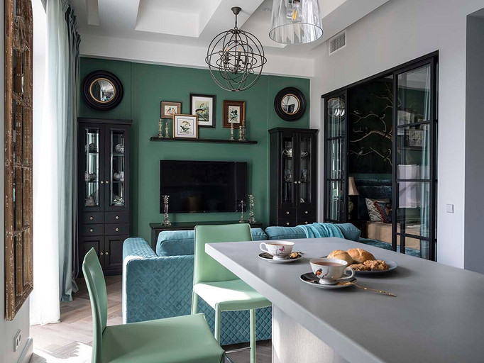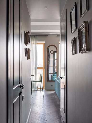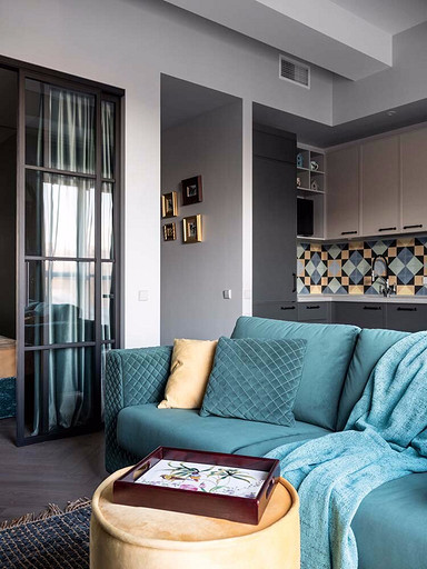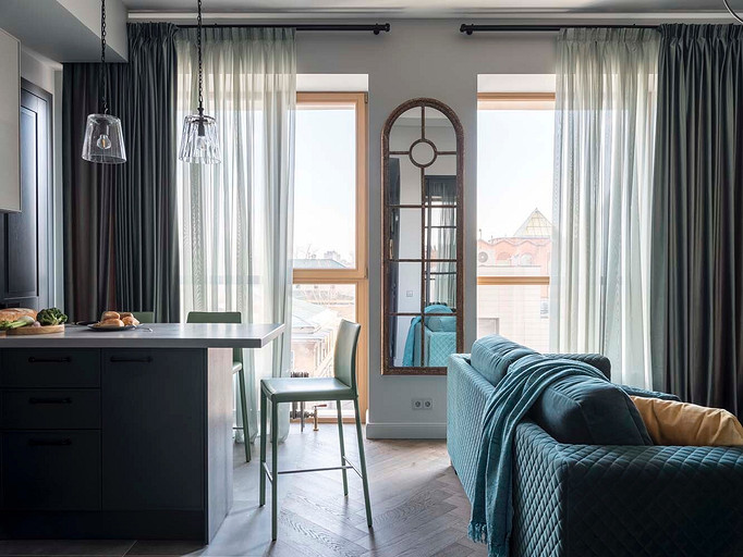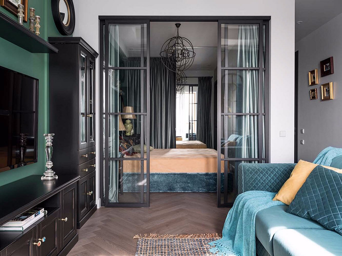 На 44 квадратных метрах архитекторам удалось продумать все важные функциональные зоны:  кухню с удобной обеденной зоной, гостиную с раскладным диваном и изолированную спальню за стеклянной перегородкой. А также вдохнуть в маленькое пространство элементы классического стиля, при этом не перегрузив его.                                    Читать далее...