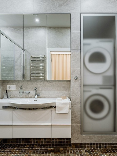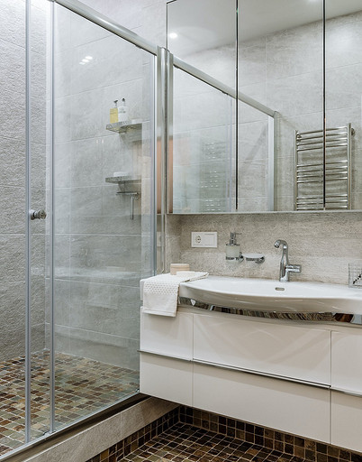 - Оборудование: раковина, тумба, унитаз — Laufen palace, душевая система Roca VICTORIA-T, душевое ограждение Cezares Pratico, смеситель для раковины Grohe Essence New