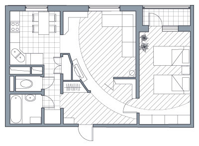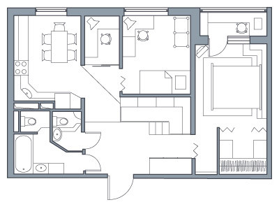 Три варианта перепланировки двухкомнатной квартиры общей площадью 53,4 м2 в панельном жилом доме серии