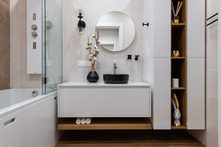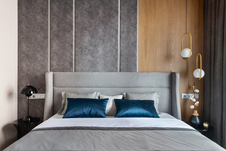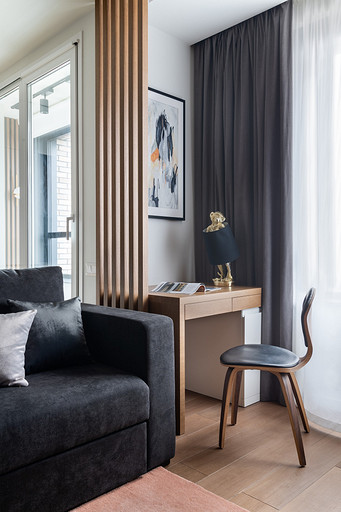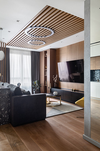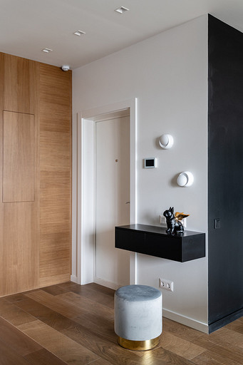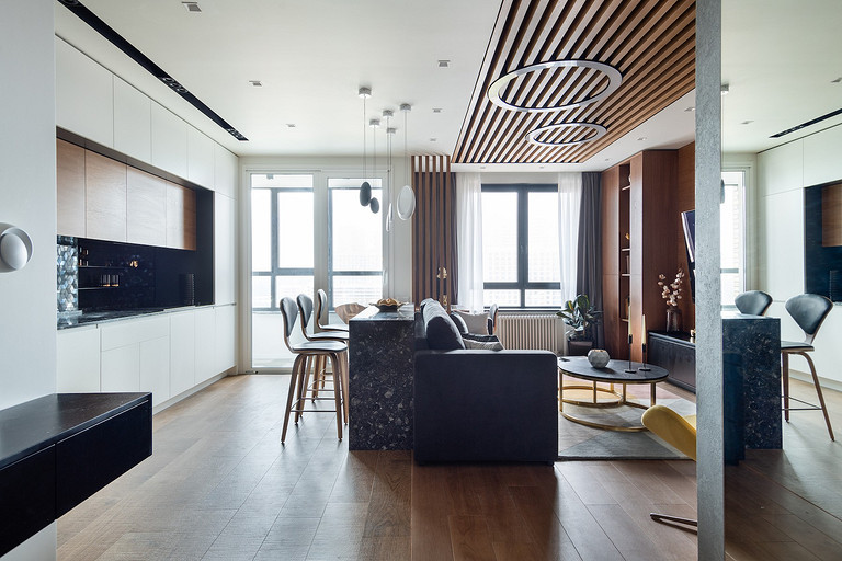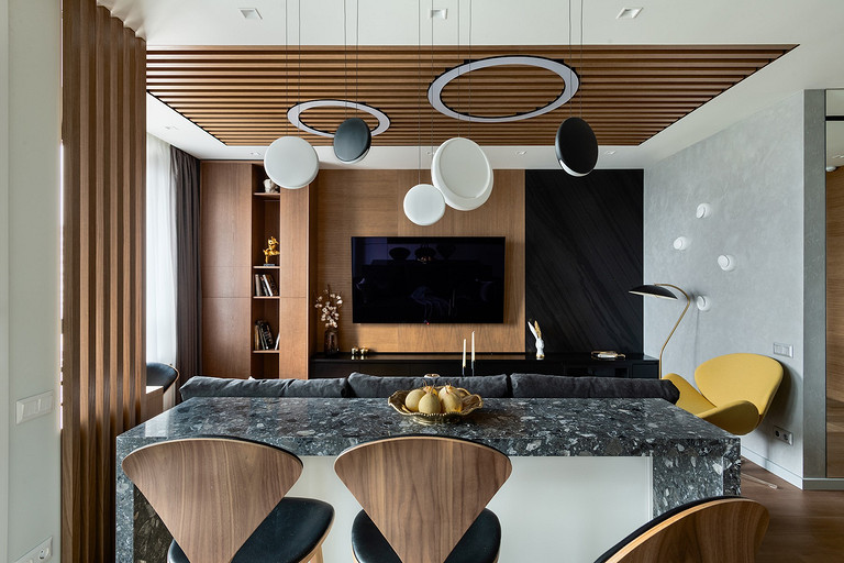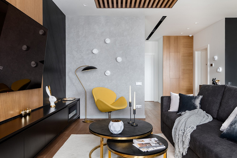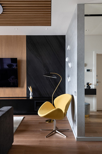Нетипичная квартира для женщины: интерьер с черными акцентами, камнем и фактурой дерева
