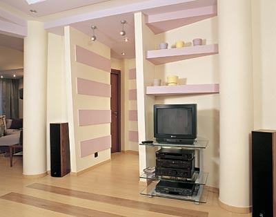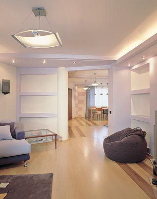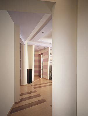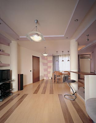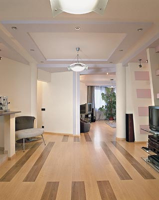 Вид через танцпол на зону домашнего кинотеатра. Композиция и пропорции цветных архитектурных украшений гармонично связаны даже с размером досок ламинированного паркета