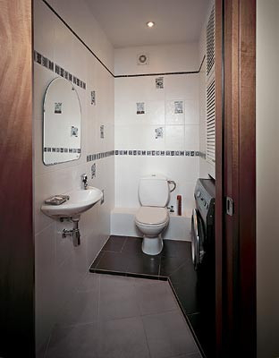 Гостевой санузел. Всантехническом коробе таится не только система разводки труб, в него почти полностью "утоплен" корпус стиральной машины (модель WM5487A, SIEMENS), такой же черной, как и плитка на подиуме. Унитаз шведский (модель Marly 8541-11, GUSTAVBERG), аналогичный поставили в ванной комнате. Компактный умывальник- модель Nordic 590-4, GUSTAVBERG; смеситель- GROHE