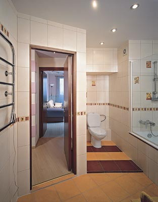 Ванная комната. Одна из дверей ведет отсюда, через небольшой пятачок паркета, в детскую. Там- такой же ламинат, но голубоватого оттенка и уложенный параллельно стенам