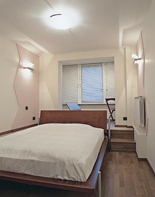 Подиум - вместительная емкость для хранения вещей. Ступени обшиты тем же ламинатом, что и пол. Кровать ZANЕTTEEOS и матрас (модель "Фаворит", 160200см) куплены в салоне "АНГЕЛИНА". Кресло на подиуме- от IKEA