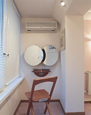 Лоджия. Плоский ореховый плинтус подобрали в тон мебели. Подиум, облицованный мягким сиреневым ковролином,- вотчина хозяйки, здесь находится ее туалетный столик