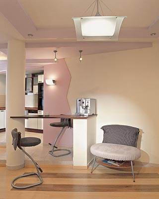 Барная стойка на границе кухни и танцпола. Барьер под стойкой выложен в полкирпича. Вся кухня- на низком подиуме. Встяжку здесь добавлен керамзит