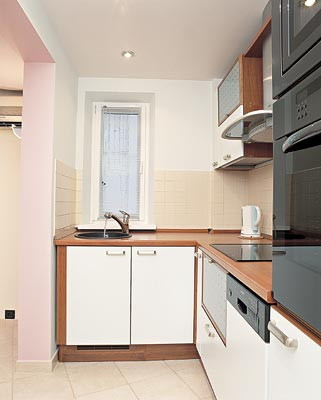 До ремонта здесь была кладовая. Достаточная площадь, близость стояков водоснабжения и наличие окошка, пусть маленького, сделали это помещение пригодным для кухни. Кухонная мебель c мойкой- ARAN NEW FORM