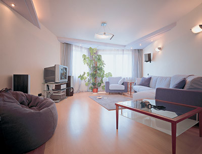 Гостиная, диванная, она же домашний кинотеатр. Взакрытом виде занавески создают в кинозале нужное затемнение.