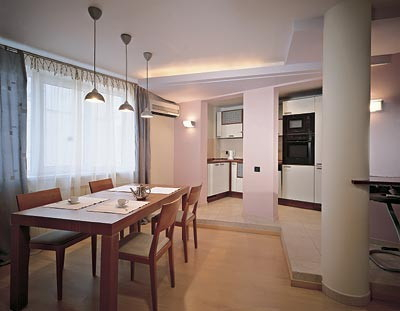 Итальянский обеденный стол-трансформер со стульями PIANCO куплены в салоне MODERNO. Для большого количества гостей его ставят параллельно кухне и раздвигают. Классическое сочетание розового и серого- вариант почти беспроигрышный
