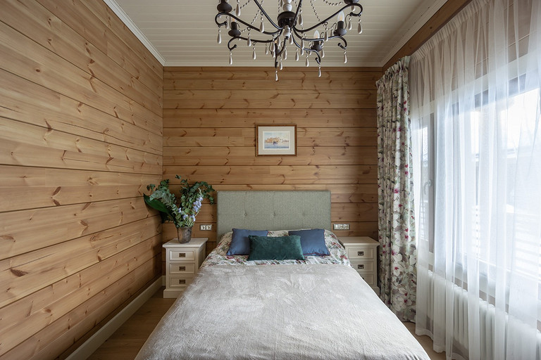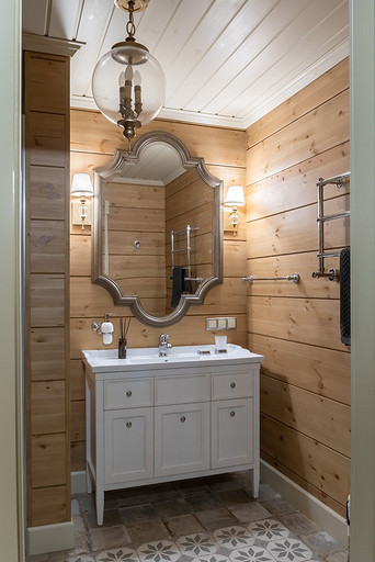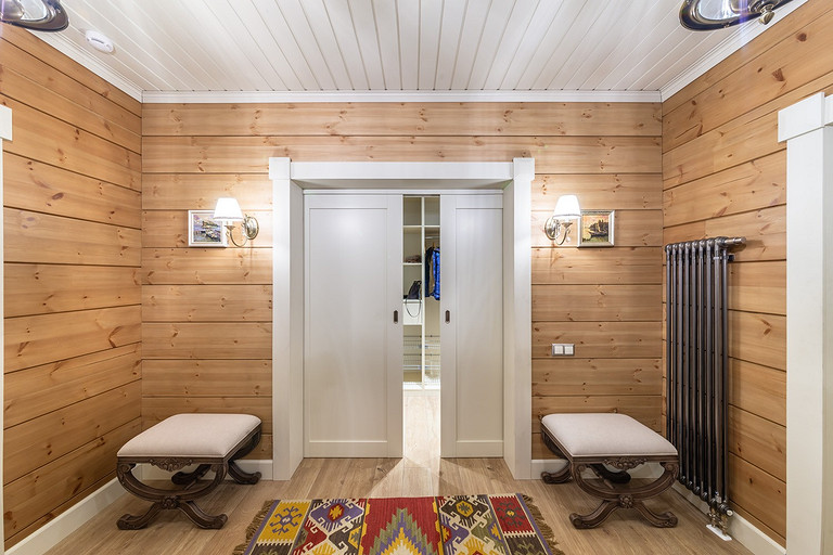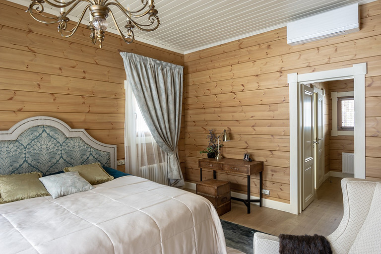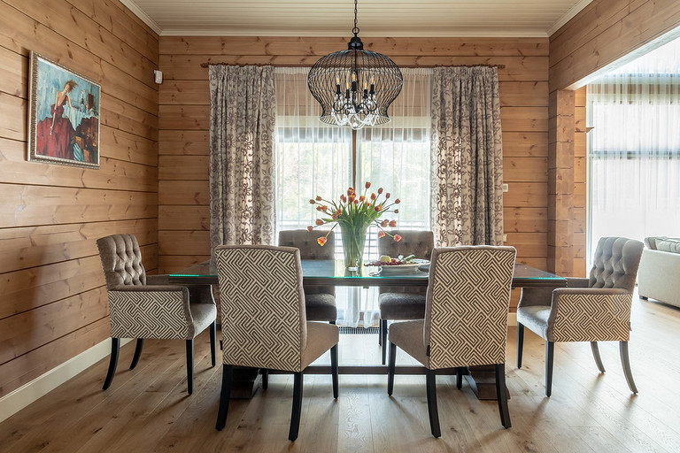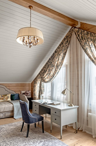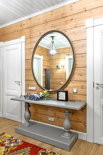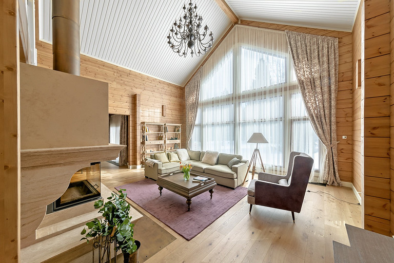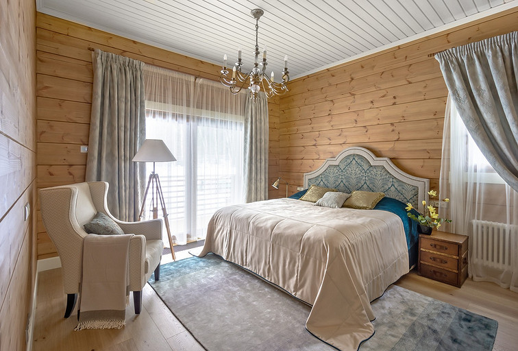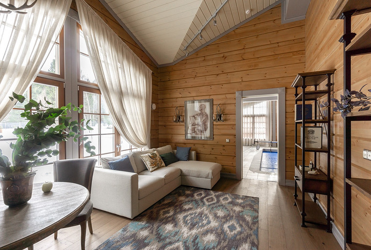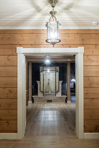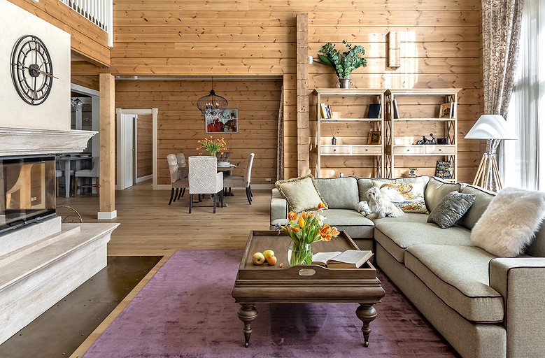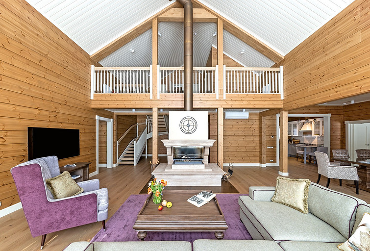 Дом с мезонином: интерьер коттеджа из клеёного бруса в стиле американской классики