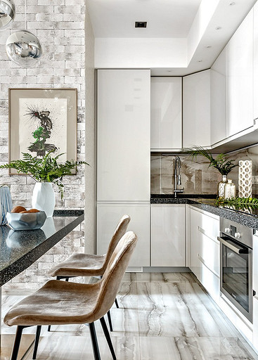 - Стены: клинкерная плитка под состаренный кирпич, фартук — керамогранит Kutahya