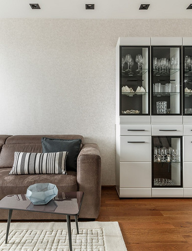 - Мебель: шкаф, тумба под ТВ — Lazurit, диван — на заказ по эскизам дизайнера