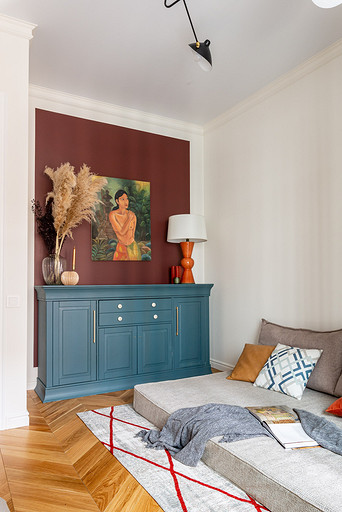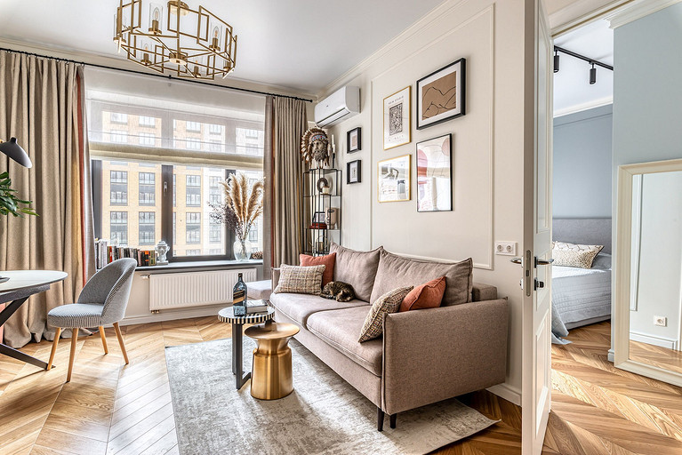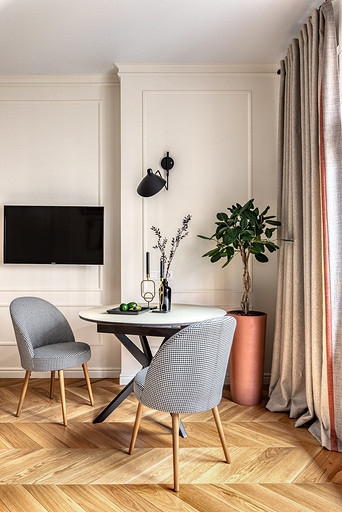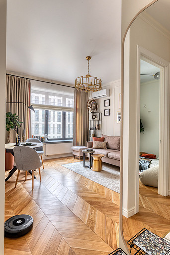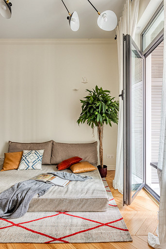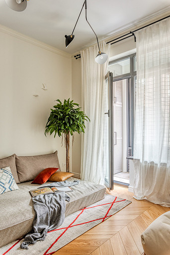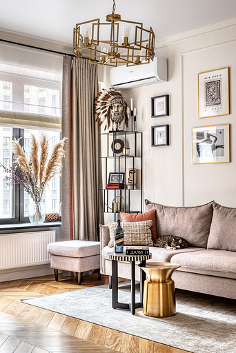 - Мебель: диван, пуф — divan.ru, стеллаж AM.PM, стол и стулья La Redoute Interiors