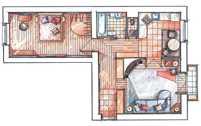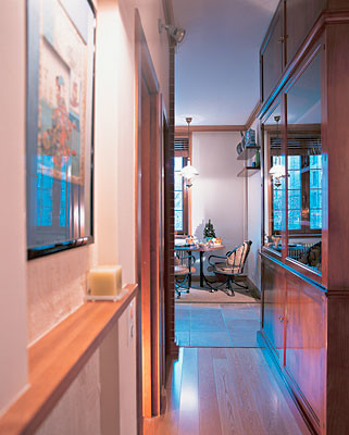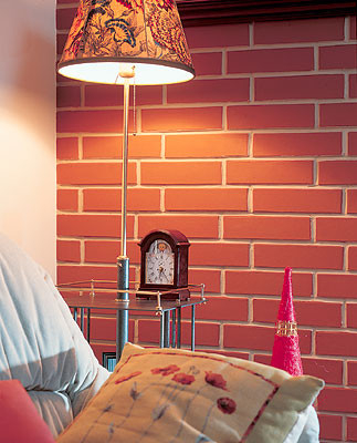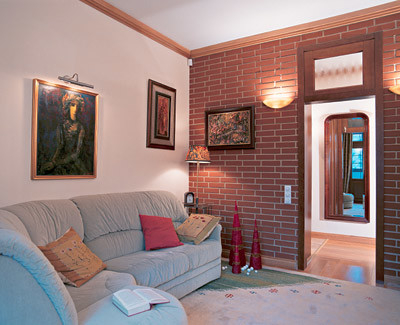 "Фирменный" элемент гостиной- стена из облицовочного кирпича. Ось обрамленного темной вишней дверного проема, дополнительно подчеркнутого двумя бра, эффектно «продолжена» расположенным на противоположной стене коридора антикварным зеркалом