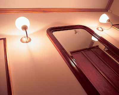 Зеркало в темной деревянной раме контрастно выделяется на фоне светлых отштукатуренных стен, увенчанных карнизом из светлого дуба