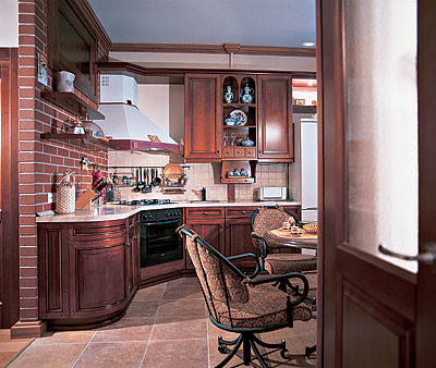 На кухне сочетание тонко подобранных аксессуаров, темного дерева мебели и бежевых квадратов гранитного пола погружает нас в патриархальную атмосферу старой Англии