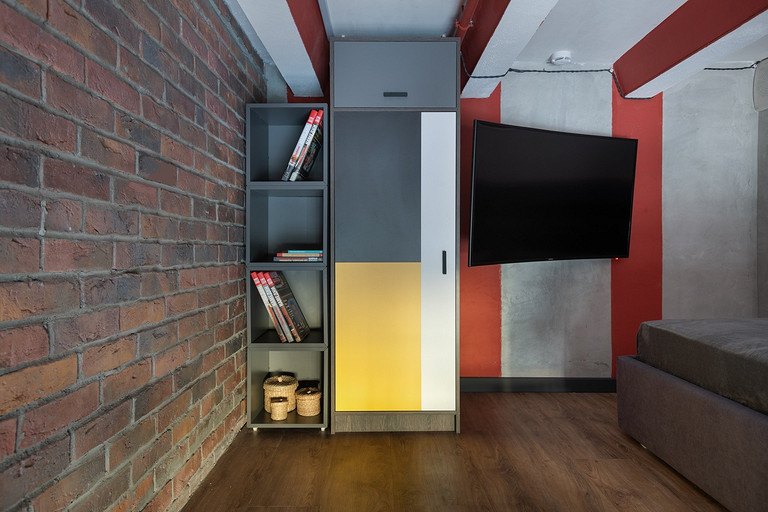 - Мебель: столик журнальный Hoff, диван ИКЕА, барные стулья Archpole, шкафы, комод, полка под ТВ Divan.ru (изготовитель — компания Вереск), кухня «Лайт»