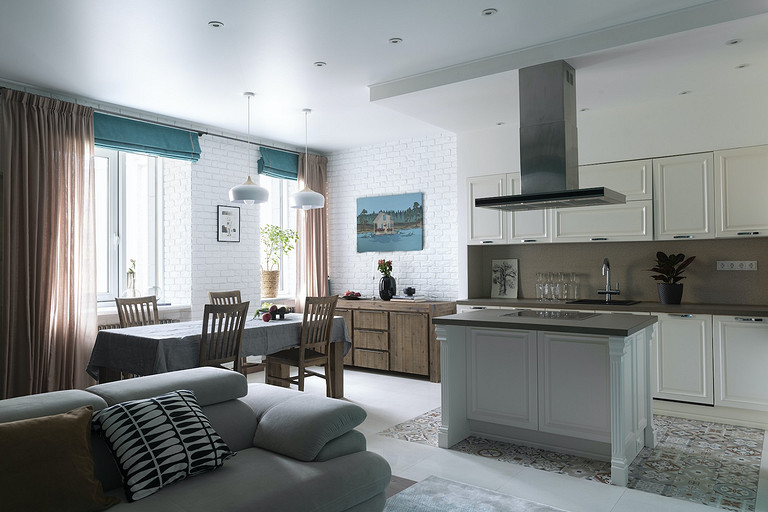 В квартире свободной планировки выделили три спальни, просторную кухню-гостиную, гардеробную, кладовую и домашнюю прачечную. Также продумали два отдельных санузла, что важно для большой семьи. Читать далее...
