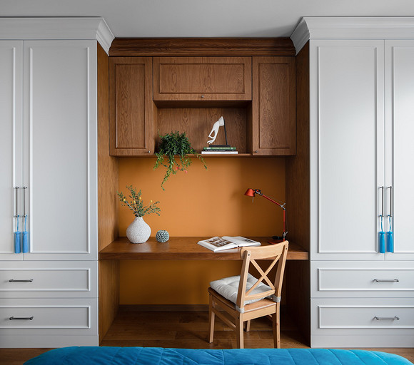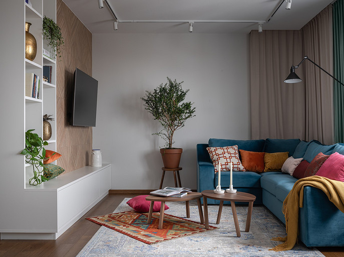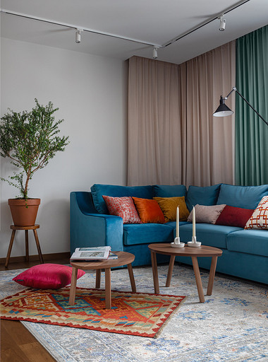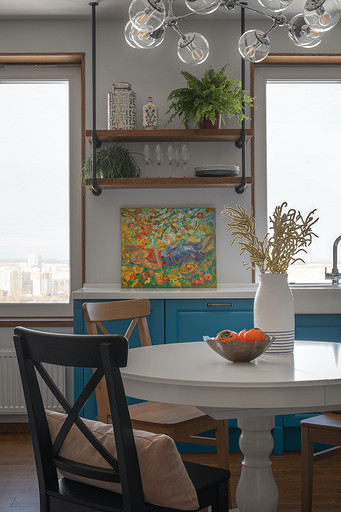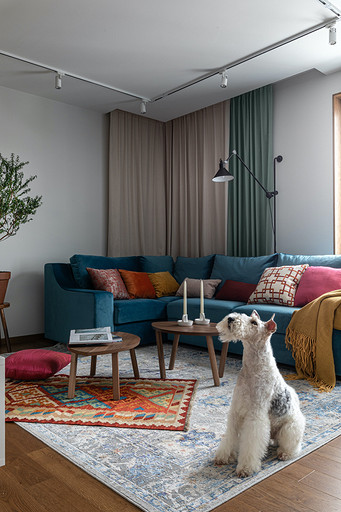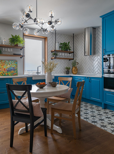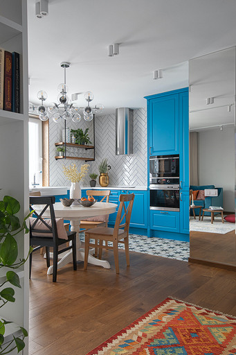 Синяя кухня, ковры-килимы, голубой диван — в этой квартире сочетаются современный комфорт, восточные мотивы и классические детали. А также продумано пространство так, чтобы было комфортно всем членам семьи, в том числе домашнему питомцу. Читать далее...