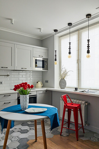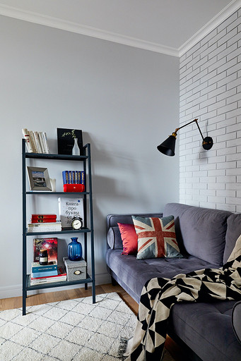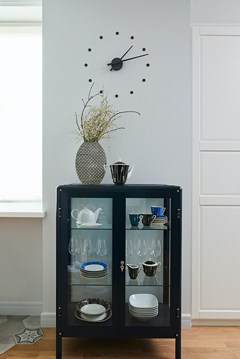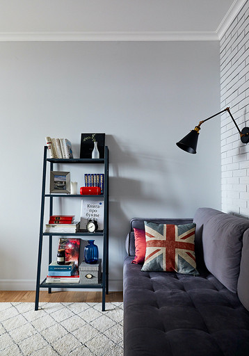 - Мебель: гарнитур кухонный «Атлас-Люкс», обеденный стол и стулья — Woodville, полубарный стул Cosmorelax, витрина, табурет, стеллаж, шкаф — ИКЕА, диван SKDesign