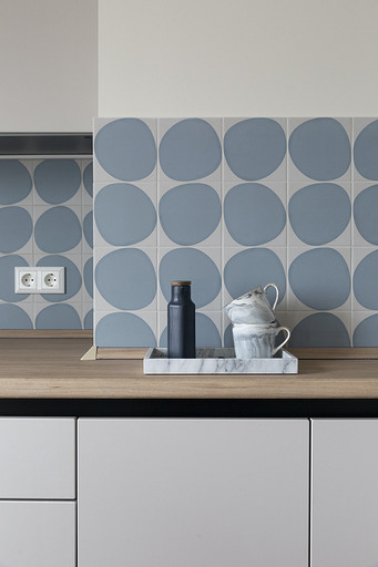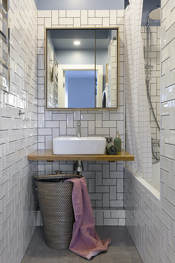 - Стены: плитка «Авеллино» — Kerama Marazzi, эпоксидная затирка серого цвета — Litochrom Starlike, краска Little Greene