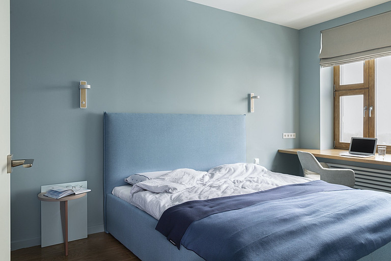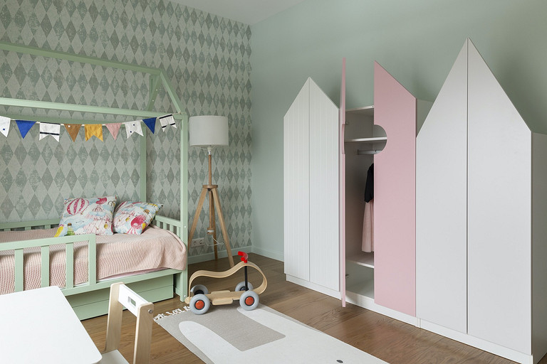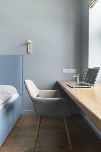 - Мебель: кровать divan.ru, прикроватные столы Pastore, шкаф Rondo, кресло Imodern, письменный стол на заказ по индивидуальному проекту — G.A.F.F