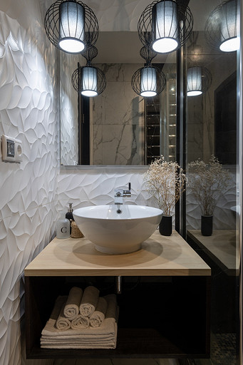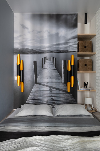 - Свет: светильник подвесной над баром и в ванной Jeneva Black — Loft It, бра у изголовья Coltrane Wall — Delightfull