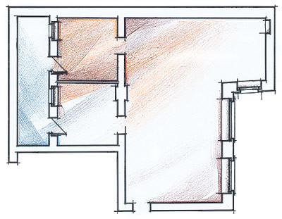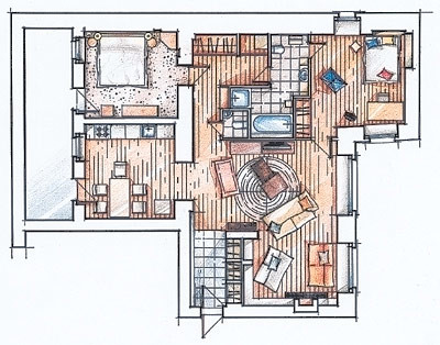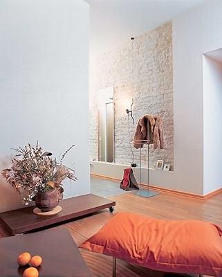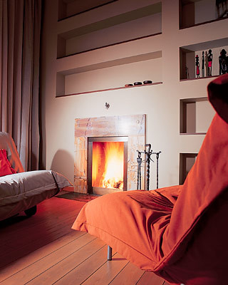 Конструктивно камин является частью стены, но в то же время создает собственную уютную зону. От оранжевого кресла исходит