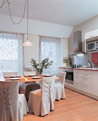 Стулья в чехлах придали кухне романтический оттенок: они напоминают молодых барышень, затянутых в корсеты. Стулья получились как будто запакованными в конверты из ткани. Для этого в цельном куске материи (32м) прорезали отверстия, вшили в них металлические скобы и продели шнуры