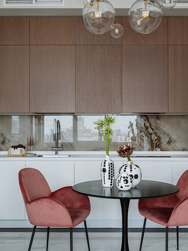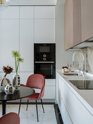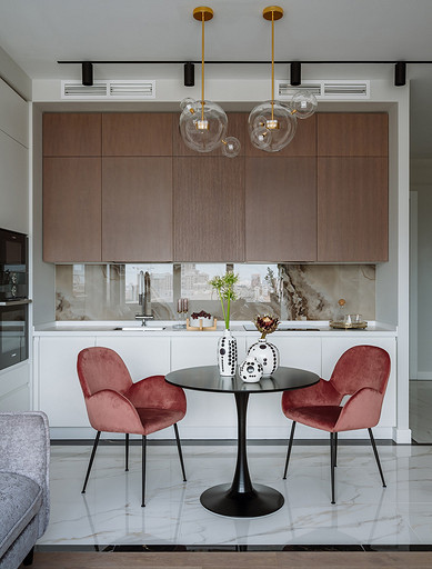 - Мебель: кухонные шкафы «Империя Кухни», верхние кухонные фасады из шпона — выполнены на заказ фабрикой Lesgrand, обеденный стол Bradex Home, стулья DeepHouse, скамья около окна выполнена на заказ фабрикой Lesgrand, диван Geniuspark, столик Zara Home