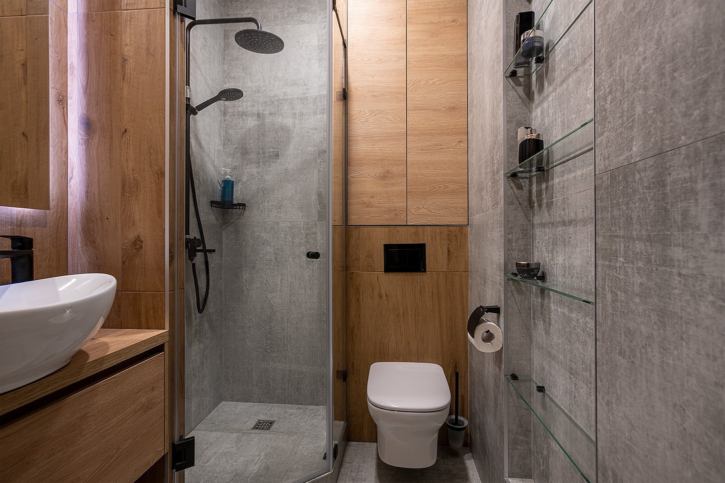 - Сантехника: унитаз подвесной Jacob Delafon Vox, система инсталляции для унитазов и кнопка смыва — Tece, душевая система Artis Tonde, смеситель на столешницу Artis Cristallo, раковина на столешницу Melana