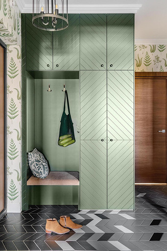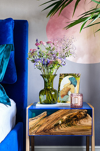 - Мебель: кровать SK Design, тумба прикроватная «Бюро опилок», кресло ИКЕА, консоль «The idea», стул Cosmorelax, шкаф выполнен по эскизу дизайнера — Vostra design