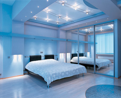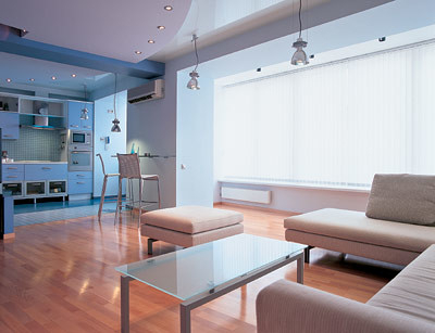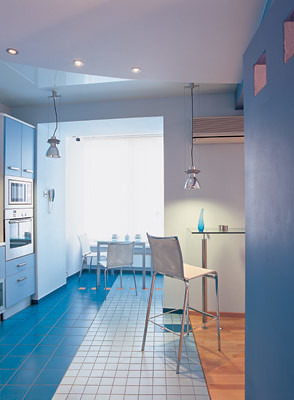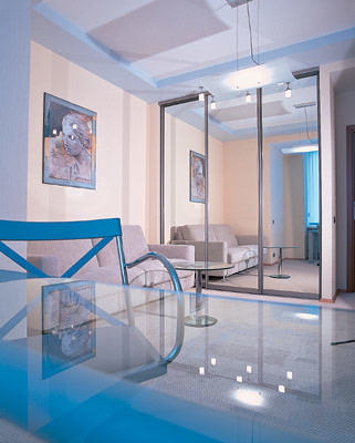 и, отчасти, кухней. Асветильники, размещенные по периметру, связывают пространство в единую композицию. Бывшая лоджия, превратившаяся в стеклянную стену,- предмет гордости хозяина