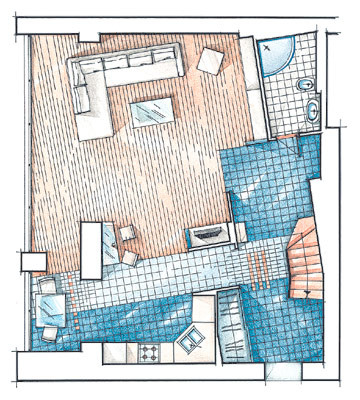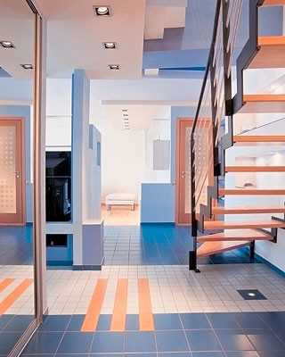 Контрастные полоски плиток и светильники на полу приглашают официальных гостей пройти из прихожей в гостиную, друзей- на кухню, "особо приближенных"- на второй этаж, в приватную зону. Зеркальный шкаф-купе функционально заменяет снесенную перегородку