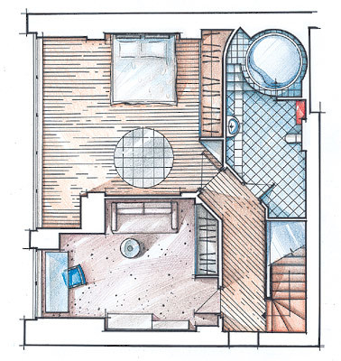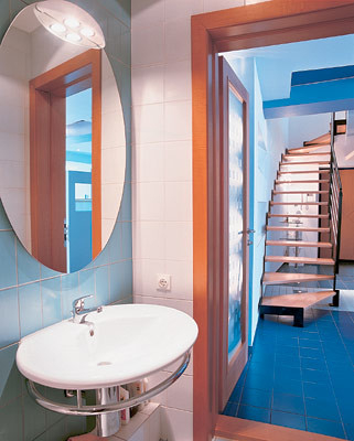 Мягкие овалы зеркала, раковины и отраженного в зеркале светильника... Будьте как дома, дорогие гости. Но по лестнице, ведущей в святая святых дома, можно будет подняться только по особому приглашению