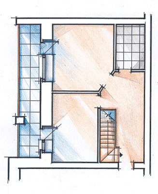 Опустив ограждение лоджии на три ряда кирпичей и возведя стеклянную стенку, в спальне добились ощущения максимального простора. Потолок балкона выше комнатного, поскольку это верхний этаж дома и балка лежит на уровне чердака. Проблему тепла решили с помощью утеплителя (толщиной30см)