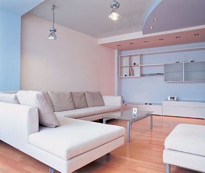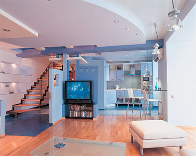 Зона отдыха организована в полном соответствии с представлениями хозяина о комфорте: мягкие светлые диваны, несколько полок, различные уровни освещения, журнальный столик, на который можно поставить чашку кофе или бокал,- что еще нужно человеку, чтобы спокойно посмотреть телевизор?