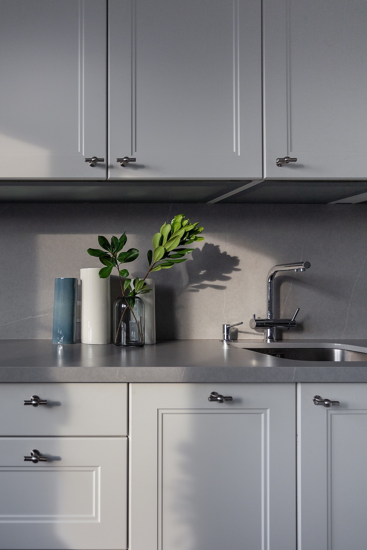 - Мебель: кухня Nolte Kitchen, столешница и подоконники — Silestone, комод, прикроватные тумбочки и диван — The Idea, журнальный столик Zuiver, портал, подвесные тумбы, шкафы — столярная мастерская, вешалка в прихожей Umage