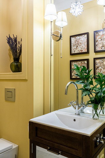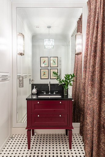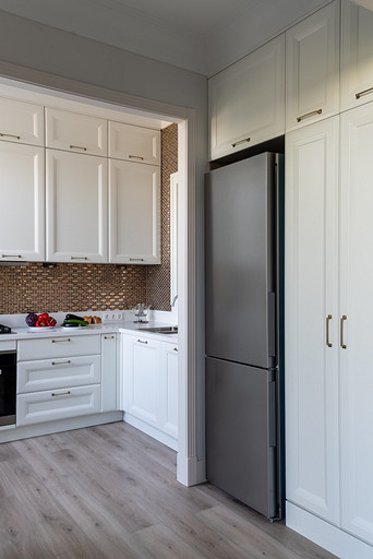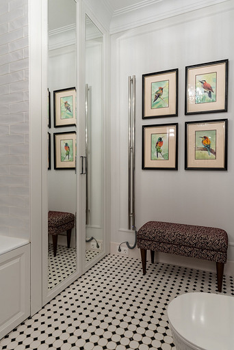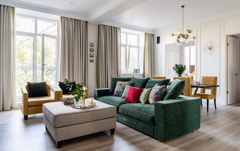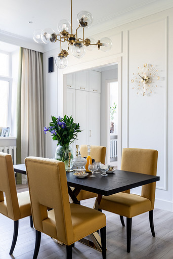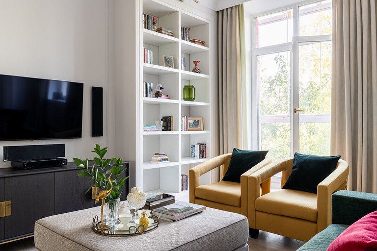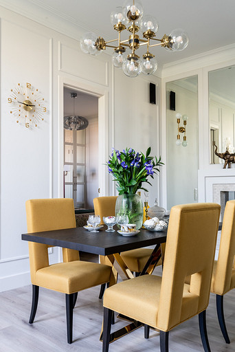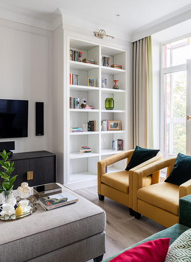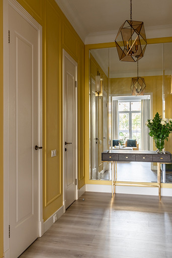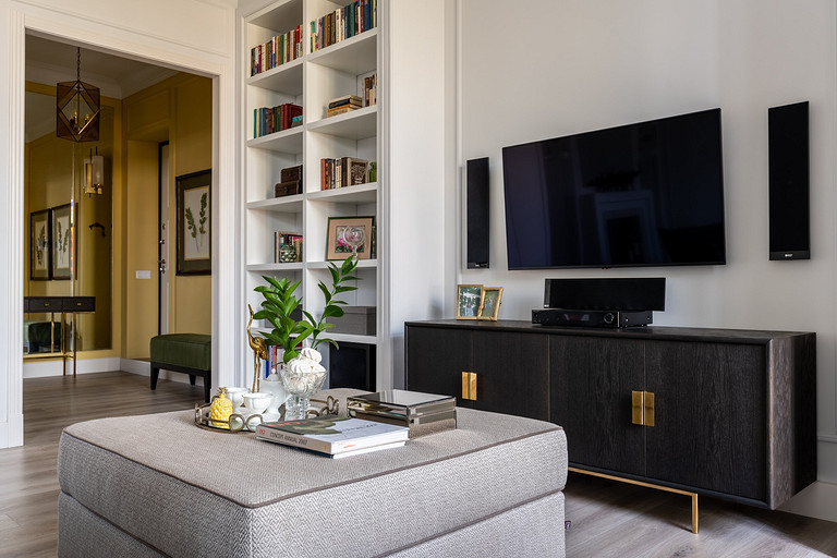 Квартира расположена в старом сталинском доме в районе Сокольники. Последний ремонт был сделан предыдущими хозяевами в 1999 году и требовал глобальных перемен. Мы выломали и вынесли из квартиры все, включая старый песок, насыпанный между плитой перекрытия и балками, несущими чистый пол. Основным пожеланием заказчицы было сохранить большие объемы помещений, поэтому было решено задействовали объем квартиры на максимум — избавиться от всех коридоров. По стилю мы остановились на легкой американской классике.