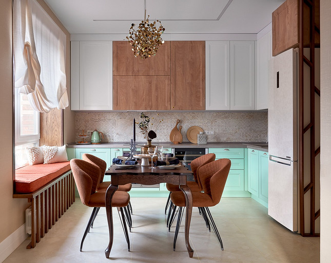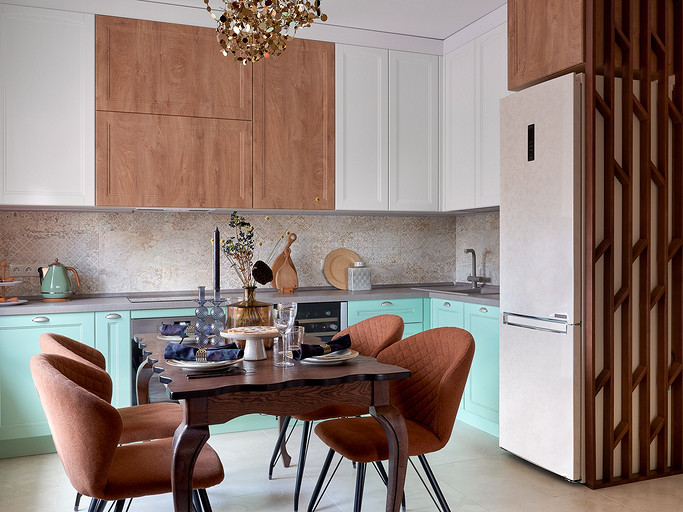 - Стены: обои Sirpi Muralto Fashion, плитка на фартуке Aparici Carpet Sand Mat