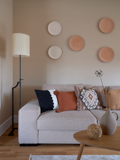 - Текстиль: микс из привезенных подушек из путешествий (Индия, Норвегия), подушки ручной работы наших текстильных мастеров, декоративные подушки — DG Home, HM Home, Zara Home