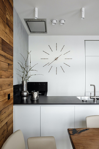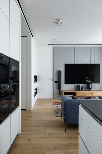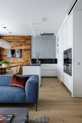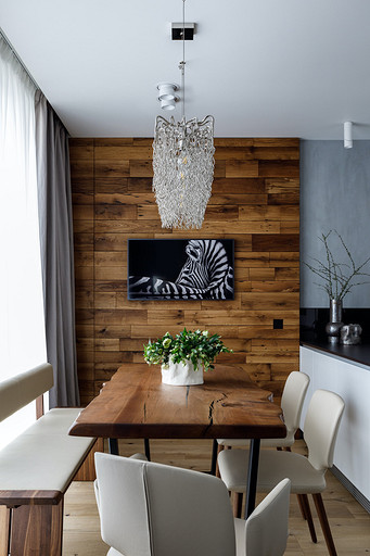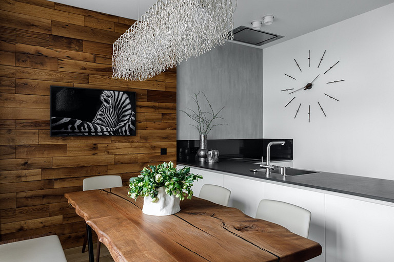 - Мебель: кухонный гарнитур Bulthaup, столешница Decton, стол Hard Massive, стулья, лавка — Team 7, диван B&B Italia, стол журнальный Rolf Benz, тумба под ТВ — Team 7, шкаф (заказной) — Axiss