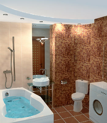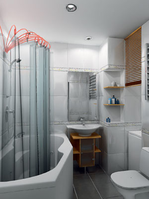 Светильник "удваивается" зеркальной поверхностью и дает вдвое больше света. Скошенный угол ванны создает удобный подход к умывальнику. Все потолочные светильники- во влагозащитных корпусах