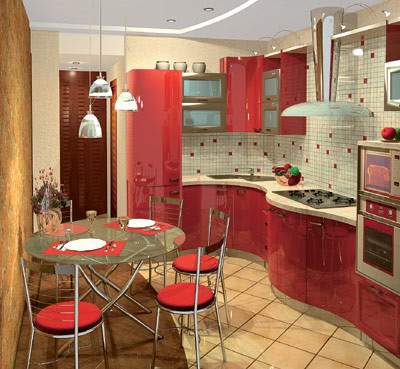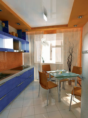 Потолок кухни выполнен из двух конструкций. По периметру и чуть ниже подшита гипсокартонная «рама» цвета охры со встроенными светильниками. А центр помещения затянут белым глянцевым полотном