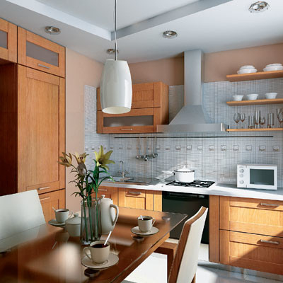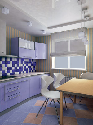 На кухне используются светильники в виде кубов, размещенные в ряд. Над фронтом гарнитура они монтируются вплотную к потолку, а над обеденным столом подвешены на длинных шнурах, длину которых можно регулировать