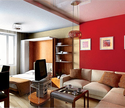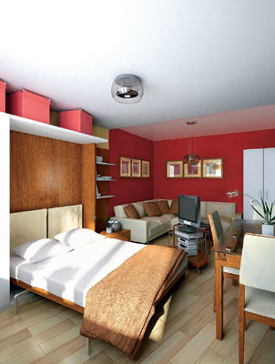 Когда кровать сложена, мы видим обычный книжный шкаф. Посередине комнаты, между диваном и спальной зоной, располагается тумба с телевизором