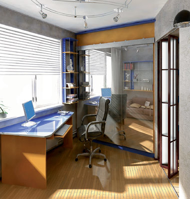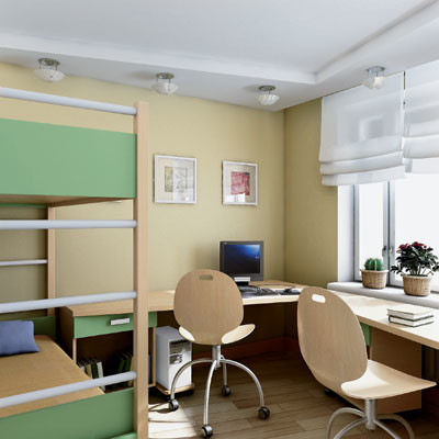Удобно решается рабочая зона детской: большой стол со скошенной столешницей предлагается расположить в углу комнаты
