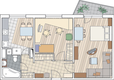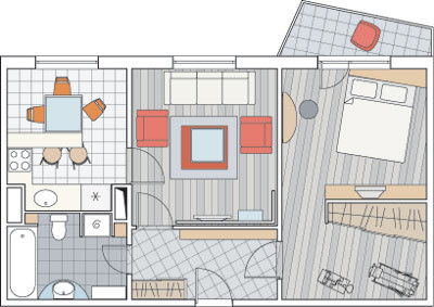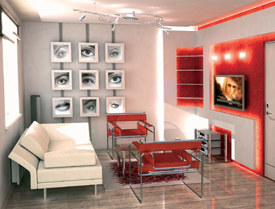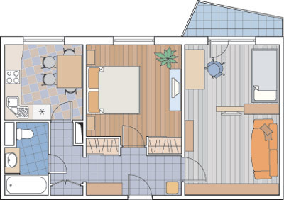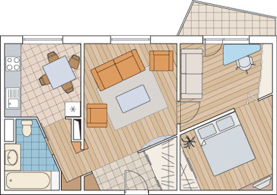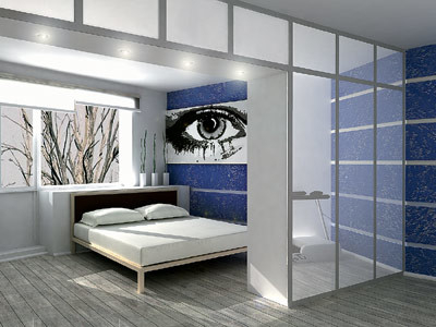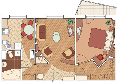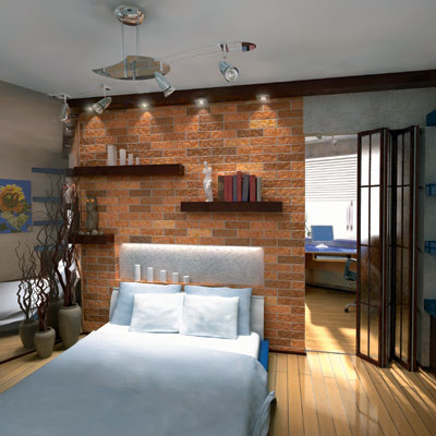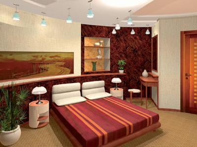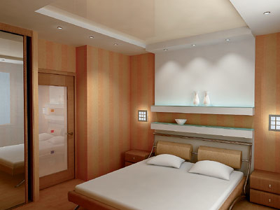 Ниша глубиной 10 см в изголовье кровати оштукатурена и подсвечивается скрытыми люминесцентными лампами, так что может служить своеобразным ночником. Направление укладки массивной доски в приватной зоне соответствует маршрутам движения